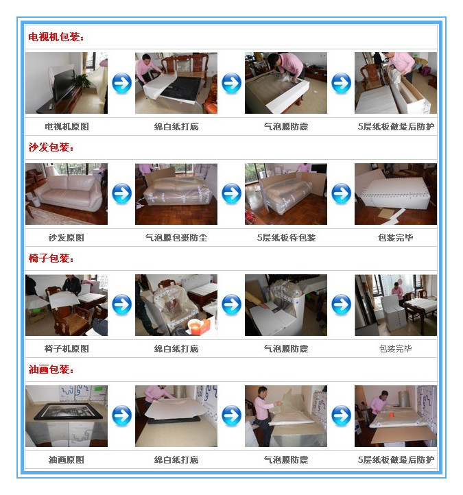 可拆卸家具一定要拆卸后包裝再進(jìn)行運(yùn)輸,家具的漆面要用硬紙板包裹,角部需要用護(hù)角包裝,電器需要采用紙箱或者木箱方式包裝,不允許有裸露無包裝部分,否則出現(xiàn)貨物破損不予以賠償。